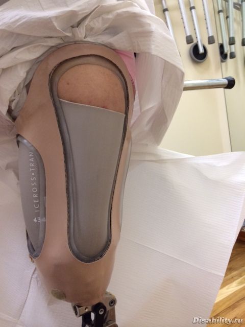 Вид с латеральной стороны. Хороши видно как сильно сдавлена культя и как не менее сильно выпирают мягкие ткани из окошек. Стив сам с удивлением обнаружил полнейшее отсутствие каких-либо следов продавливания или натирания под пелотами на коже культи даже после 4 часов пользования протезом!!! И вот его слова (цитата): "Perfect fit, no rotation whatsoever, no skin redness." Перевожу: "Четкая (совершенная посадка, вообще никакой ротации, отсутствие покраснения кожи".