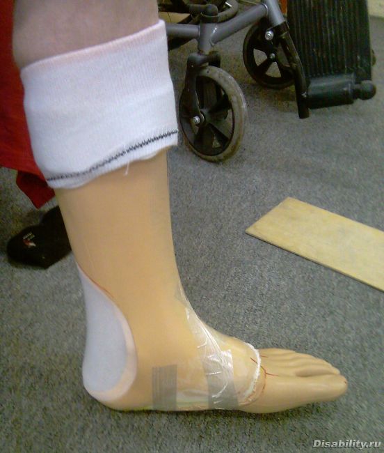 На видео: конечно, совсем хорошего результата не достигли – у пациента правая нога с протезом голени и, так как до этого он ходил с бумажками в обуви, выработалась не очень хорошая (и т.д.) походка. Однако без протеза стопы уже не ходит, неудобно. На очереди изготовление новых протезов. Видео полное, вместе с надеванием.