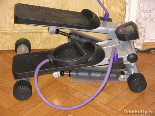 Фото и описание средств реабилитации, спортивных тренажеров и т.д.Работает самым тривиальным образом, на разгибание ноги в колене, имитируя тем самым подъем по ступенькам. Можно отрегулировать высоту "ступеньки", а вот сопротивление постоянное, с помощью двух поршней. Счетчик позволяет следить за количеством шагов и временем занятия.