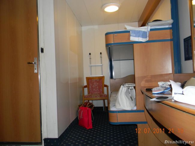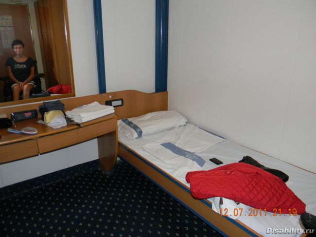 Каюта для инвалидов на пароме. Достаточно удобная, есть где развернуться...ширина дверей - хорошая. Ванная комната - большая, со спец. душем для инвалидов и раковиной, к которой можно подъехать без проблем.