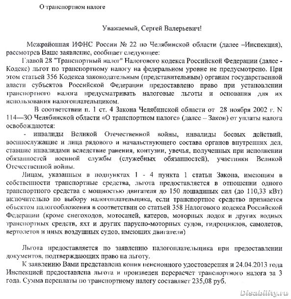 Транспортный налог на авто для инвалида 1 группы.Обратился в налоговую по транспортному налогу используя онлайн обращения через сайт налоговой. Изложил проблему, вопрос, необходимые статьи и туда же приложил сканированные документы (удостоверение инвалида и справку МСЭ). Времени у них ровно месяц со дня обращения. Завтра месяц как отправил письмо и сегодня получен положительный ответ!
