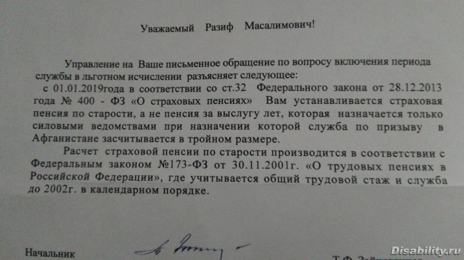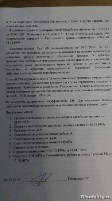 Выход на пенсию с 55 лет для инвалидов БД"военная травма"Спасибо. Я уже 2 раза писал заявление. На похожее заявление мне дали очень пространный ответ.Вынужден был повторно обратится. Копию прилагаю. 10 января записан на прием. В случаи не удовлетворения моих законных прав, буду подовать в суд. Ребята, здесь я буквально борюсь не только для себя,но и для того, чтобы остальных Афганцев,Чиченцев не зажимали.