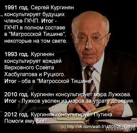 1991 год. Сергей Кургинян консультирует будущих членов ГКЧП. Итог - ГКЧП в полном составе в "Матросской Тишине", некоторые на том свете.
