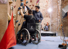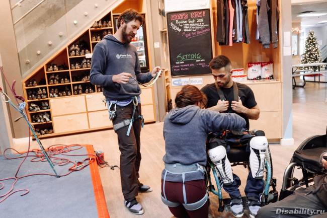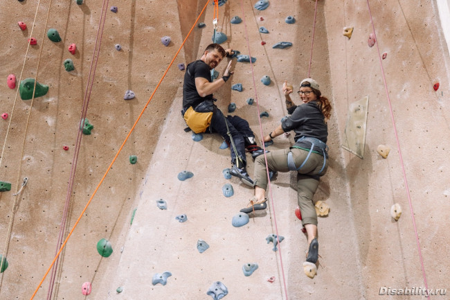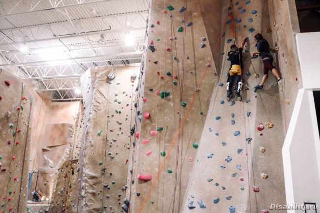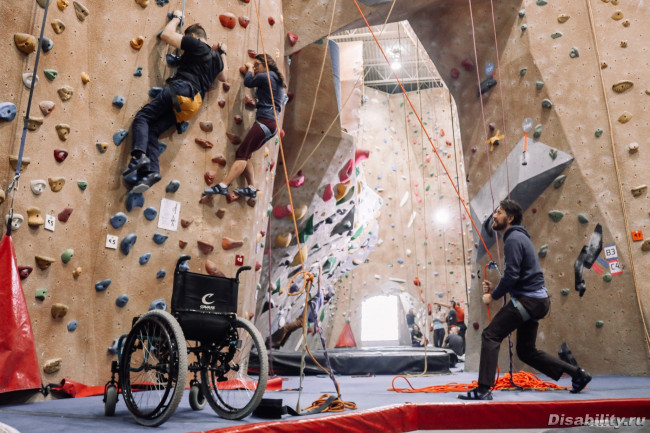 В городе, для колясочников работает секция адаптированного скалолазания... несколько фото с последнего мероприятия. Поначалу учат в зале, а летом занятия на природе, взбираются по реальным горам.