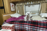 Не знаем... утром тронемся дальше или задержимся здесь ещё на одни сутки. А пока... ни реки, ни всего остального, я не видела - ночь... отвыкла я от полной темноты. Степан с Лолкой всю дорогу провели на этом диване, он всегда за её широкую спину прячется... а шторы во время пути закрываем, чтобы огни встречных автомобилей их не беспокоили.