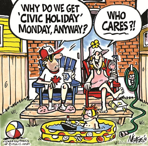 Сегодня в Канаде самый странный праздник в году. Ещё в позапрошлом веке (1876 год) власти решили сделать для работающих граждан, дополнительный выходной и думали как бы его назвать. В конечном счёте появился Гражданский день, он вообще ни о чём, просто лишний день для отдыха в первый понедельник августа.