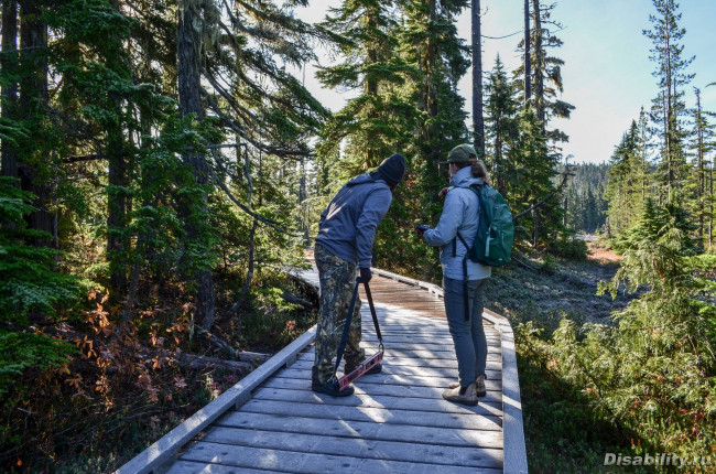 Как живётся инвалиду - колясочнику в Канаде.Под стендом, как и в других парках, лежат проспекты-карты с пояснениями, которые люди могут брать с собой, чтобы не заблудиться. А тропы другого цвета… они для людей у кого нет проблем с мобильностью. Пальцем он показывает водопады, куда они добрались, делая по пути все эти замеры.