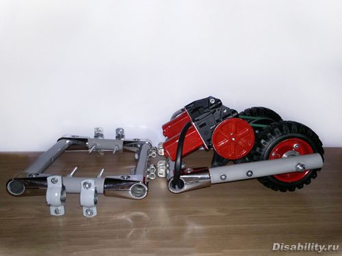 Электроприводы для колясок.Наш его приделал еще в 2005 году, только у нашего можно ездить и на аккумуляторах и на бензине, а у вашего только бензин, по паркам и скверам не