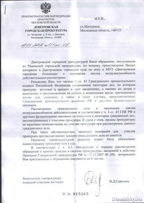 Вопрос Юристам. Может ли прокуратура представлять интересы инвалида 2-й группы ?Вот что ответил зам. прокурора Дмитрова Савельев: "рассмотрение гр.дела о признании листка нетрудоспособности действительным в соответствии с ч. 3 ст. 45 ГПК РФ и др.федер.законами не относится к категории гр.дел, рассматриваемых с участием прокурора. В связи с этим, органы прокур-ы не наделены полномочиями на участие прокурора пр рассмотрении данного гр.дела. в соответствии с п. 6.3 Инструкции о порядке рассмотения обращений граждан в системе прокуратуры, введенной в действие прик. Ген.прок. РФ от 17.12.07. № 200, возвращаем Вам приложенные к обращению документы на 6-и листах". Однако в приложении нет самого главного - моего заявления на имя прокурора о моей защите. Прокурор Раменского, наверное его не выслал. а выслал только приложение к нему. Как я запуталась, что же делать? Просить Прокурора МО уже поздно, как Вы советует. Решение вступило в силу. Может жалобу на обоих? Но я сама не напишу. а адвокаты не хотят.