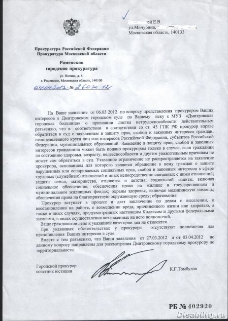 Вопрос Юристам. Может ли прокуратура представлять интересы инвалида 2-й группы ?пОЛУЧИЛОСЬ. Теперь ответ раменской прокуратуры пробую