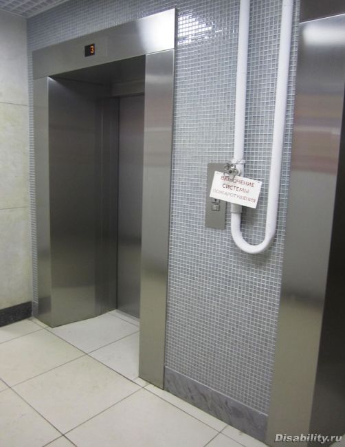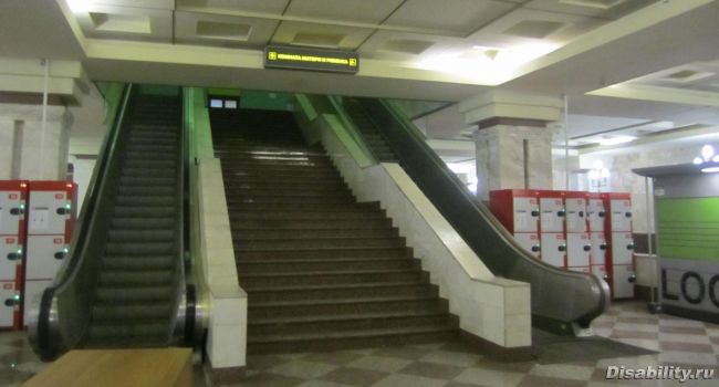 Ступеньки и два эскалатора. По словам сотрудников, эскалаторы никто никогда не видел работающими. Лифта нет.