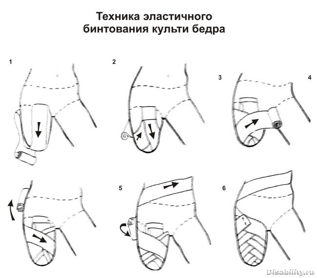 1) На рис.1 петля бинта, идущая спереди назад, по моему мнению, не нужна. Надо начинать сзади и далее по рисункам. чтобы руки были свободными, отмотай начало бинта по длиннее и сядь на него, натяни бинт, поднимись наверх (на переднюю сторону бедра), дотяни до паховой складки, перегни бинт под 90 градусов и, двигаясь по передней стороне бедра изнутри наружу, закрепи начало бинта парой витков вдоль паховой складки. А потом по диагонали за 1,5-2 оборота уходи до самого конца культи и так же поднимайся наверх. Следи, чтобы, в итоге, не оставалось свободных от бинта участков культи. На рисунке 4 показано, как рулон по ягодице поднимается от медиальной (внутренней) стенке культи и по задней стенке, заходит на ягодицу и дальше поднимается снаружи и спереди на уровень талии. Оборачивается вокруг талии (рис. 5) и со спины опускается снова на ягодицу сзади, и, переходя на латеральную (наружную) сторону, снова идет по культе вниз. Т.е. перекрестье бинта, уходящего наверх (на талию) и возвращающегося вниз, должно находиться сзади, и ни в коем случае не спереди!!