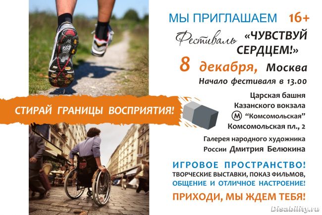 Друзья !!! 8 декабря 2012 начало в 13-00 в Царской башне, что в доме 2 по Комсомольской площади (здание Казанского вокзала, м. Комсомольская), проводится уникальный фестиваль "Чувствуй сердцем". Цель: сблизить людей с инвалидностью и без, создать для всех уникальную возможность пообщаться с теми, чья жизнь устроена совсем по-другому. Формат: игровое пространство ("Мафия", "Монополия", "Уно" и другие игры). Проводятся мастер-классы по всяким полезным штукам, концертные выступления.