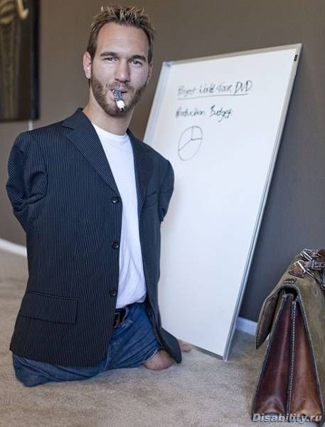 Вот Ник Вуйчич, у него нет ни рук, ни ног. Увидела фото недавно в инете и думаю, блин, вот это да, проблемы у мужчины, мои то просто отдыхают по сравнению с ним. И счастье то своё нашёл, женился, и у него даже ребёнок недавно родился. Кстати, жена у него просто красавица и здоровая.