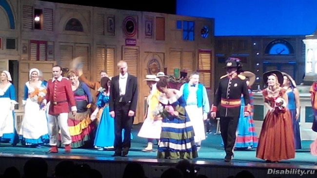 Сайт театра имеет страницу о доступности – . На самом деле пару ступенек в самом начале преодолеваются с помощью переносного пандуса, далее в гардероб и на лифте можно попасть 2-й (партер), 3-й этажи (буфет), есть и туалет, но не помню где. Меня поставили с левой стороны партера, попробовал первый ряд, но затем сместился в четвертый для лучшего обзора.