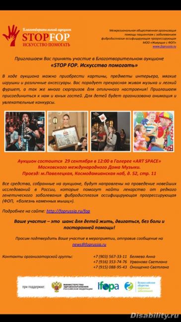 Как привлечь народ на благотворительный аукцион?Это очень редкое генетическое заболевание – ФОП, неизлечимое на данный момент. Больных с таким заболеванием очень мало, врачи до сих пор часто не могут диагностировать данное заболевание и ставят ошибочно – САРКОМУ.
