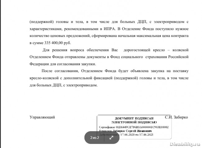 В соответствии с заявлением от 27.12.2020г. и ИПРА № 1292.11.74/2020 от 01.12.2020г. Вы состоите на учете в филиале №2 Отделения Фонда для обеспечения кресло-коляской с дополнительной фиксацией (поддержкой) головы и тела, в том числе для больных ДЦП, с электроприводом.