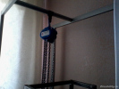 подъем в вертикализатор (параподиум)Очень даже работает. Не стал брать электрическую, взял самую простую таль, она цепная, китайская, на 250 кг (брал небольшого размера). Сшил ремень как у парашютистов, но только нижнюю часть: на ноги и за поясницей. В передней части два отрезка с каждой стороны с петлями под карабин. Карабин цепляю за крючок на цепи, тяну нужную цепь и поднимаюсь потихоньку, так же и спускаюсь обратно. Шил из автомобильного б/у ремня безопасности.