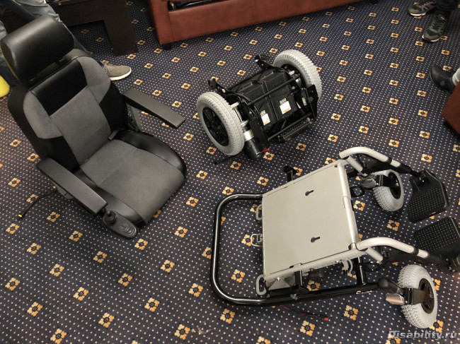 На случай поломки есть механическая самая простая коляска, правда управлять ей самостоятельно я всё-равно не смогу, поэтому буду максимально быстро решать проблему с ремонтом. На b400/500/600 насколько я знаю не возможно быстро разобрать до такого состояния (см.фото). Я специально просил реализовать возможность складывания сидения (спинка к сиденью) и подъём подлокотников вместе с пультом чтобы можно было убирать всё сиденье в салон авто.